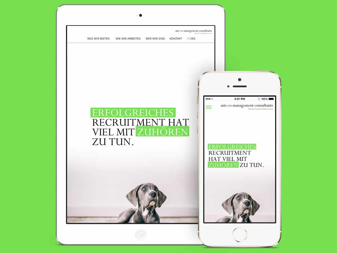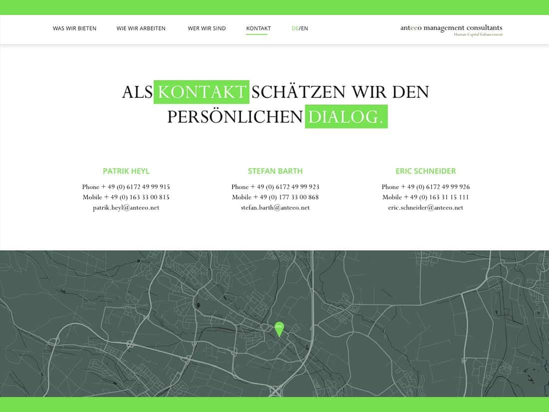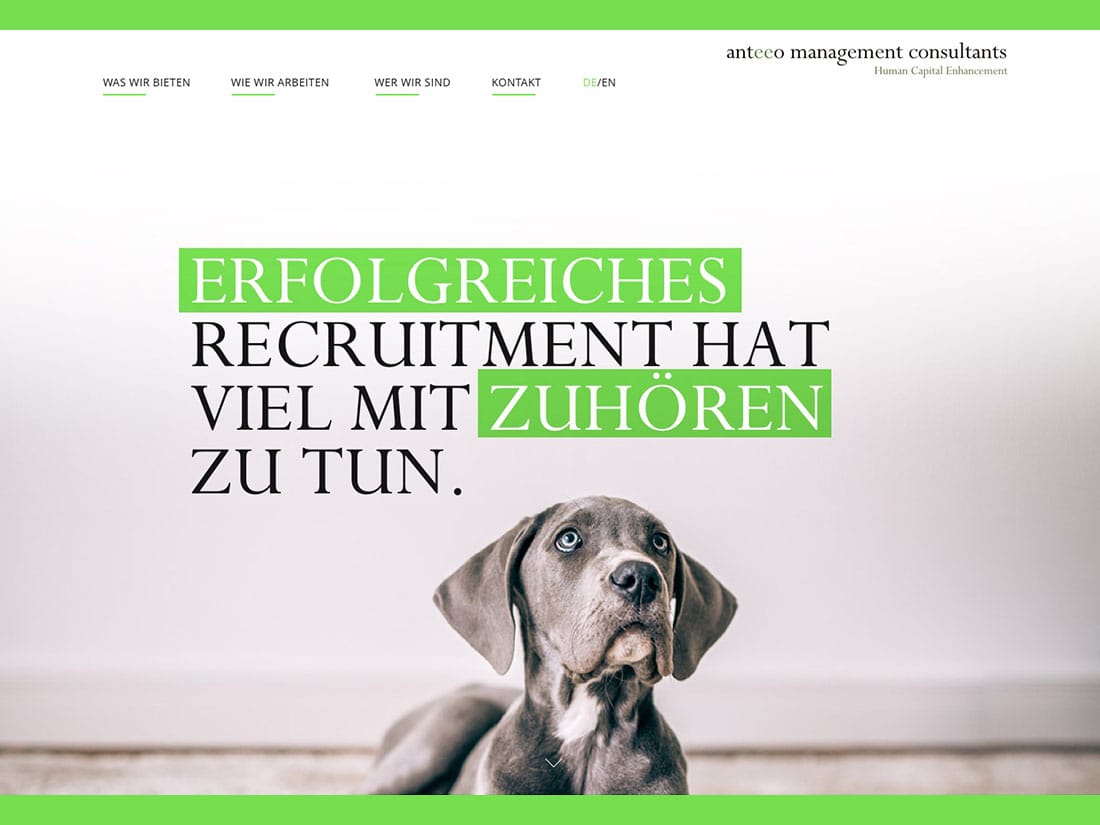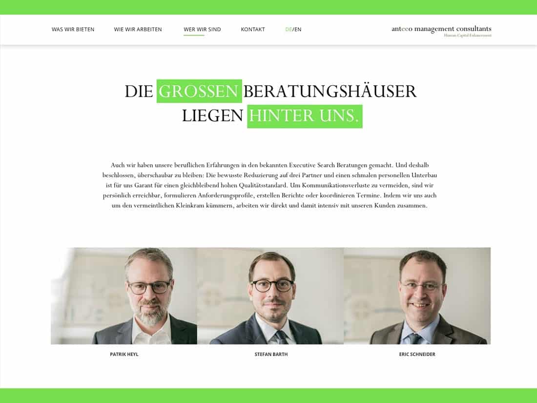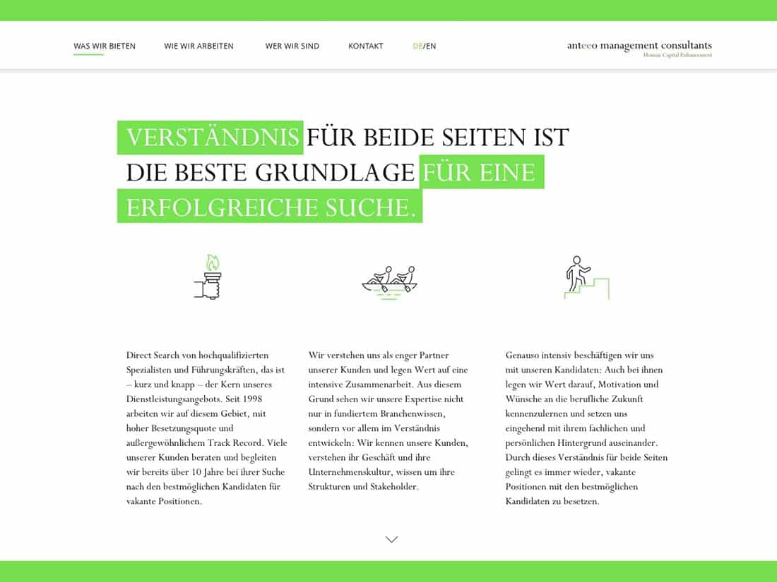 Für das Bad Homburger Unternehmen anteeo management consultans entwickelte WIESBADEN AM MEER den konzeptionellen und gestalterischen Relaunch der Corporate Website. Der neue Auftritt sollte die persönliche Beratung, den hohen Anspruch an die Qualität und Professionalität der Arbeit widerspiegeln.