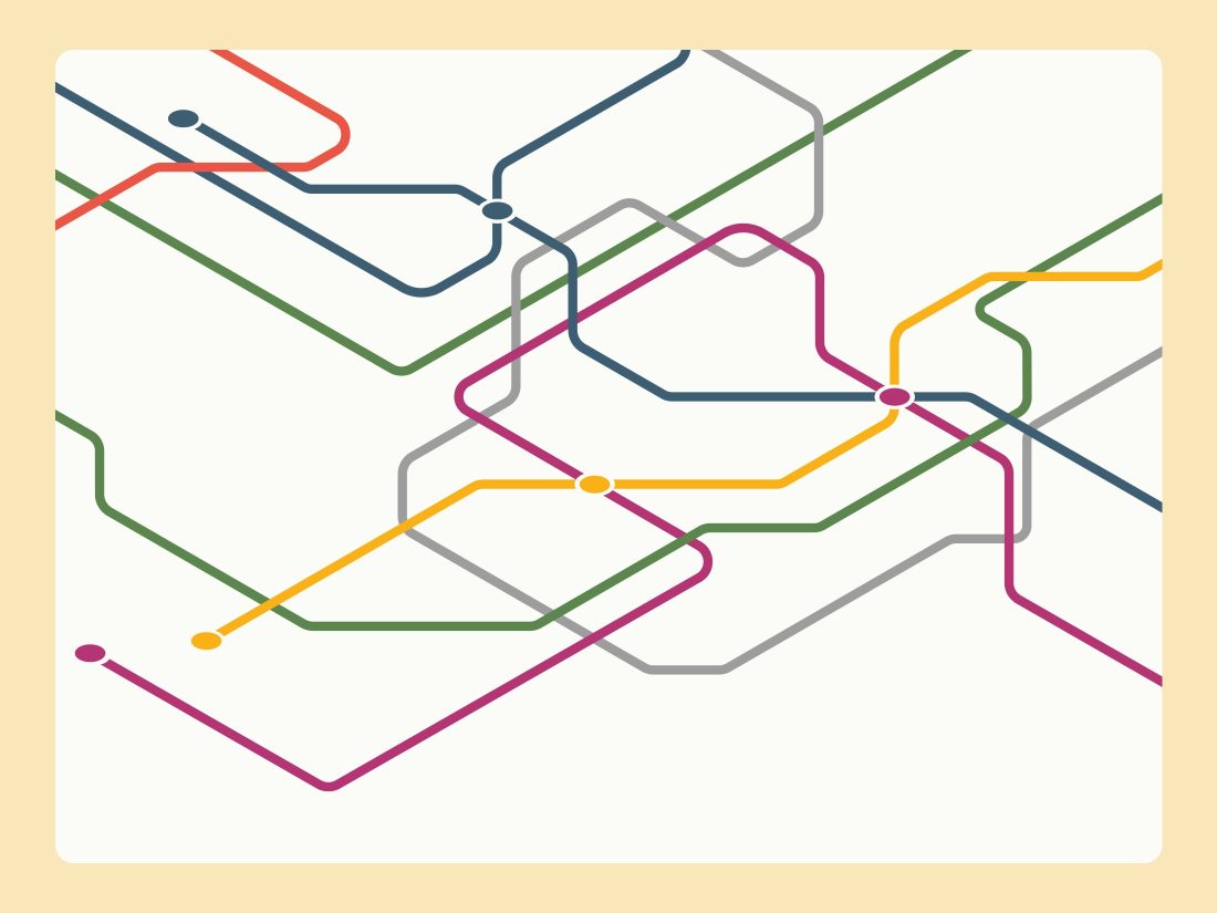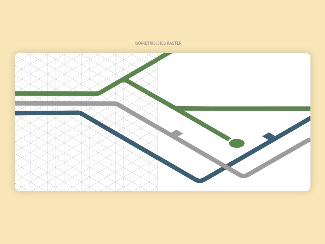 Dieses Raster dient als Grundlage für die grafische Darstellung von Linien und Stationen, die an den Aufbau eines S-Bahn-Linienplans erinnern und eine symbolische Struktur erzeugen.
