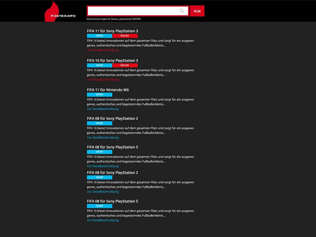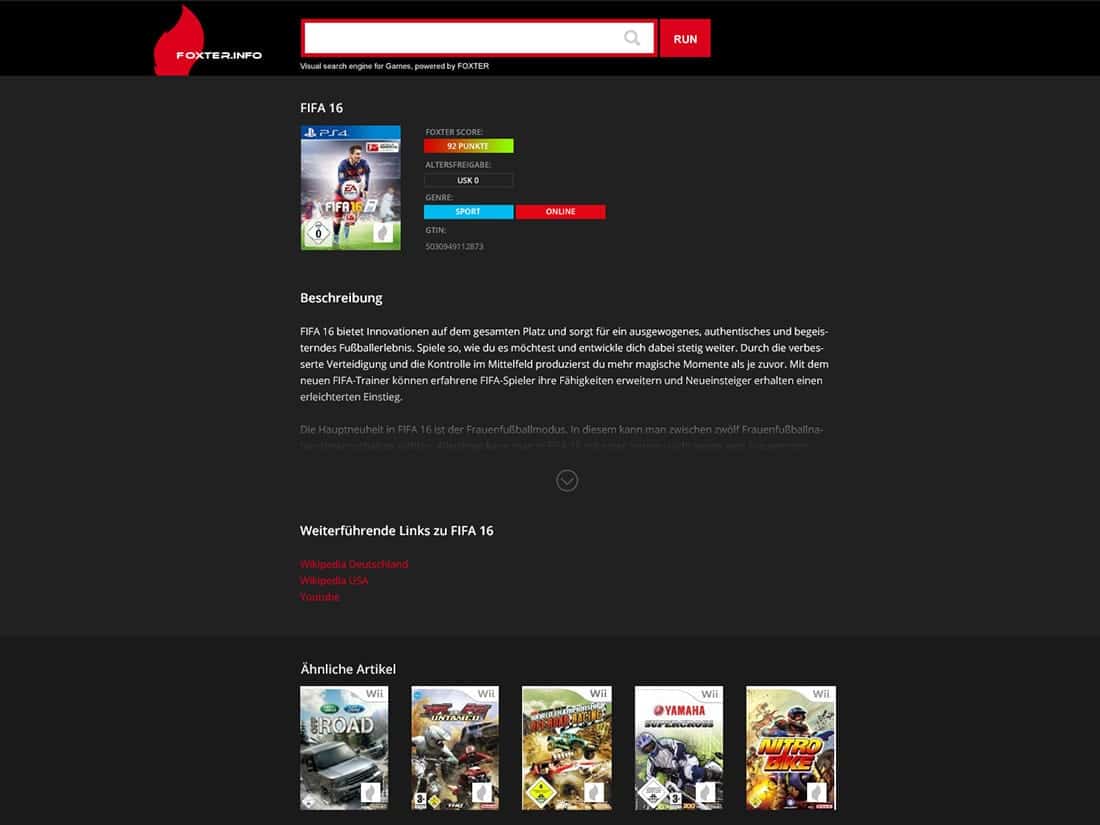 Foxter.info ist die Suchmaschine für Games. Durch die sehr große Anzahl an Spielen, aktuell sind 15.000 Spiele von Atari bis PS4 enthalten, kann die Foxter.info als erster Einstieg für die Information über alle Konsolenspiele verwendet werden. Sie gibt nicht nur alle relevanten Informationen zu den Spielen, sondern zeigt ähnliche Spiele zu jedem Titel an, die dem Besucher als Ideengeber für sein nächstes Spiel dienen kann.