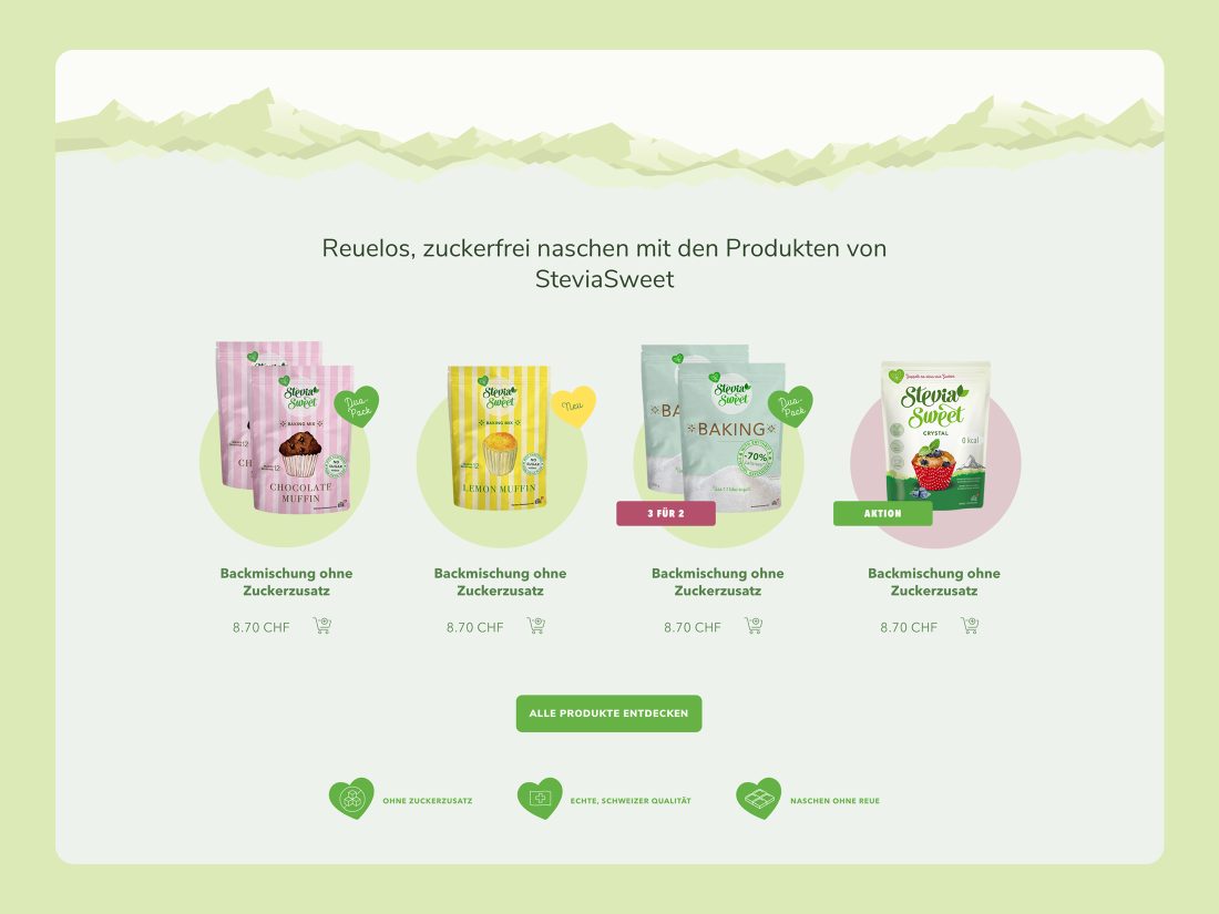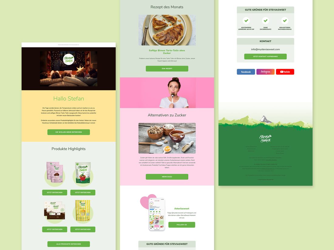 Die Hermes Süssstoff AG aus der Schweiz benötigte für ihre Marke SteviaSweet neue Brand Online Guidelines. Gemeinsam mit unserem technischen Partner MODULARTE wurde in diesem Zuge der Online Auftritt und der Shop einem Relaunch unterzogen. Zusätzlich wurde der Newsletter neu gestaltet und in Mailchimp neu aufgebaut.